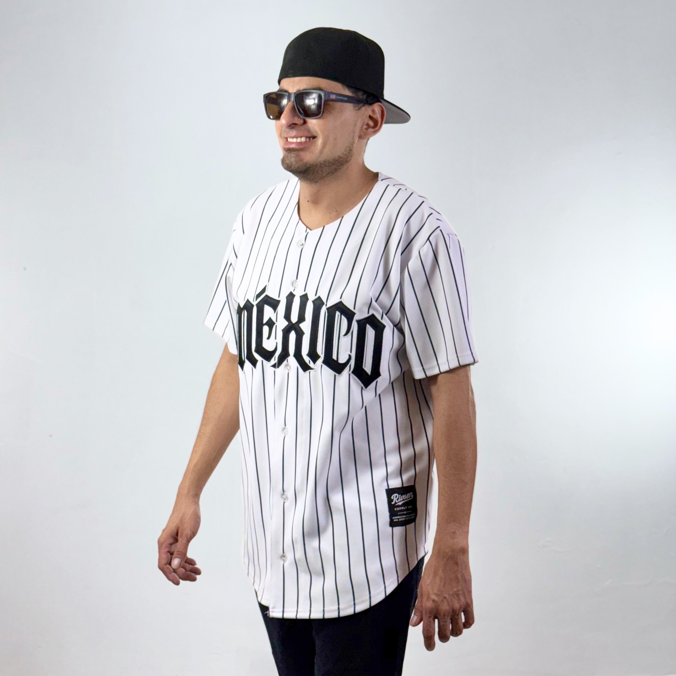| Details | 100% polyester fabric Black pinstripe construction Embroidered “Mexico” front wordmark Button front closure Athletic structured fit Woven Rivsen Supply Co. label Part of the Rivsen 32N collection |