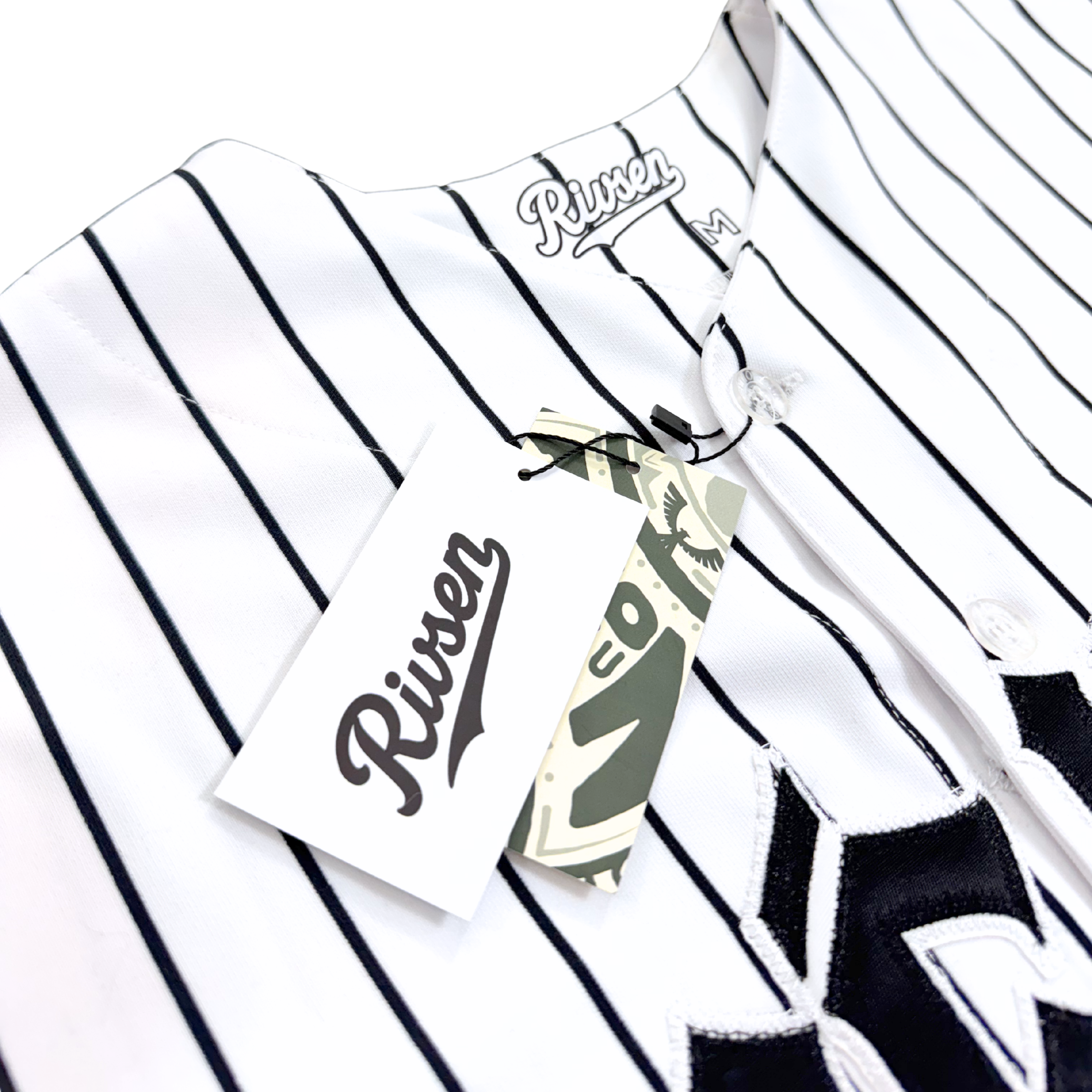 Crafted from structured polyester fabric, the jersey maintains the silhouette of a traditional baseball jersey while adapting comfortably to everyday environments. The pinstripe pattern adds visual rhythm while keeping a clean, balanced look